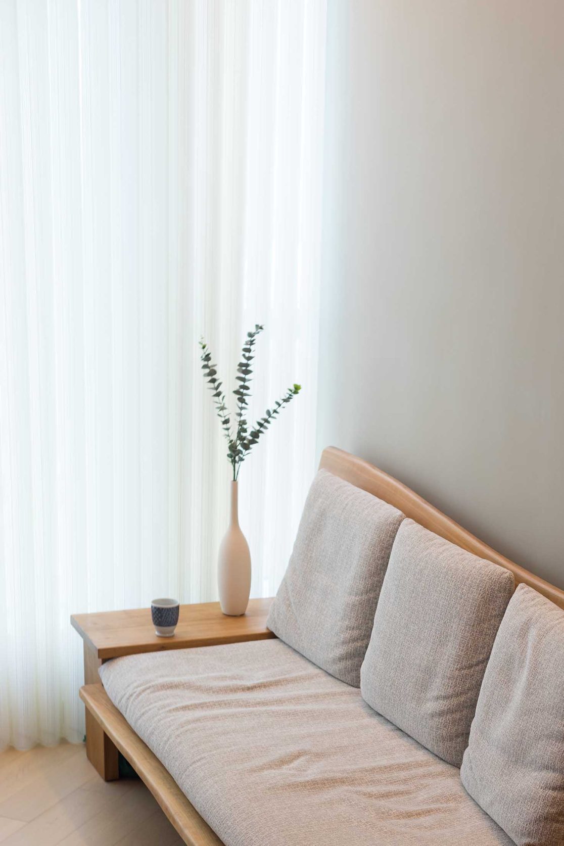This 590 square foot residence is using the style of modern Japanese design. Located in a new development in the heart of Kwun Tong city center, the two-room apartment has been transformed into a serene and peaceful living space for a couple and their child.